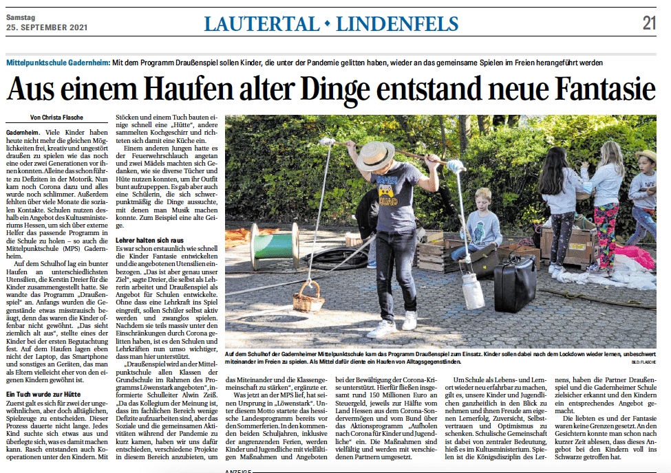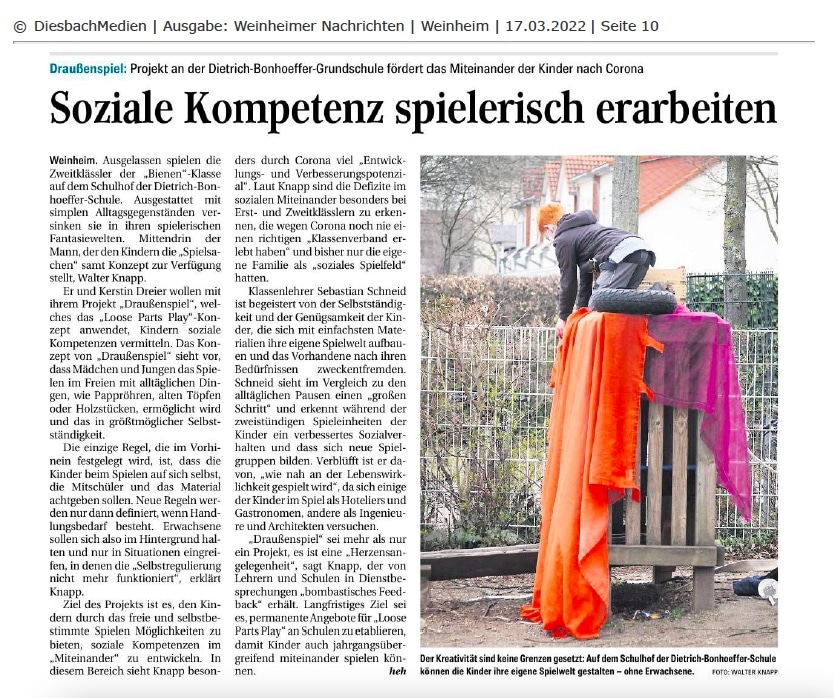 Juni 2022: Zwei Wochen spielen in Hohensachsen an der Sepp-Herberger-Schule hat mega viel Spaß gemacht … und hier kommt der Artikel dazu aus der Weinheimer Woche (www.lokalmatador.de).